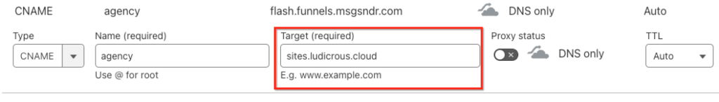 CNAME: Bạn có thể thêm một bản ghi CNAME cho các subdomain với giá trị sites.ludicrous.cloud.